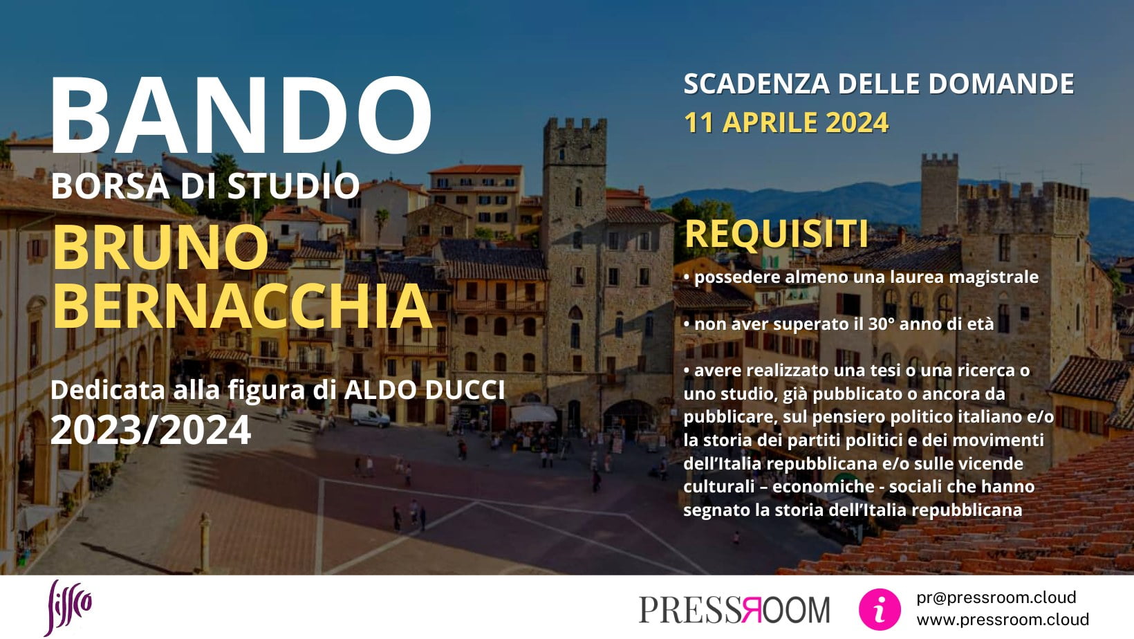 Sul sito pressroom.cloud è stato pubblicato il bando della quinta edizione della borsa di studio “Bruno Bernacchia”, il concorso che dal 2016 si svolge ad Arezzo ogni due anni per volontà dell’associazione “Amici di Bruno” e in collaborazione con della Società Italiana per lo Studio della Storia Contemporanea (Sissco). L’organizzazione e la segreteria della Borsa di Studio Bruno Bernacchia sono curate dall’ufficio stampa e promozione di PressRoom, mentre la Sissco compone il Comitato scientifico. L’obiettivo principale della borsa di studio è quello di premiare giovani umanisti e storici italiani sotto i 30 anni: nelle passate edizioni i vincitori sono stati Jacopo Perazzoli (2016), Chiara Di Cataldo (2018), Giorgio Lucaroni (2020) e Andrea Ostuni (2022).