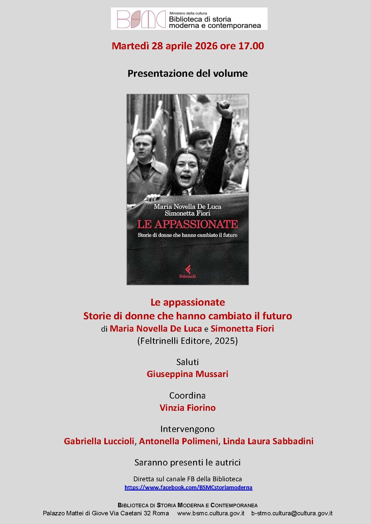 Martedì 28 aprile 2026, alle 17.00, a Roma, presso la Biblioteca di storia moderna e contemporanea (Via Michelangelo Caetani, 32), sarà presentato il volume «Le appassionate. Storie di donne che […]