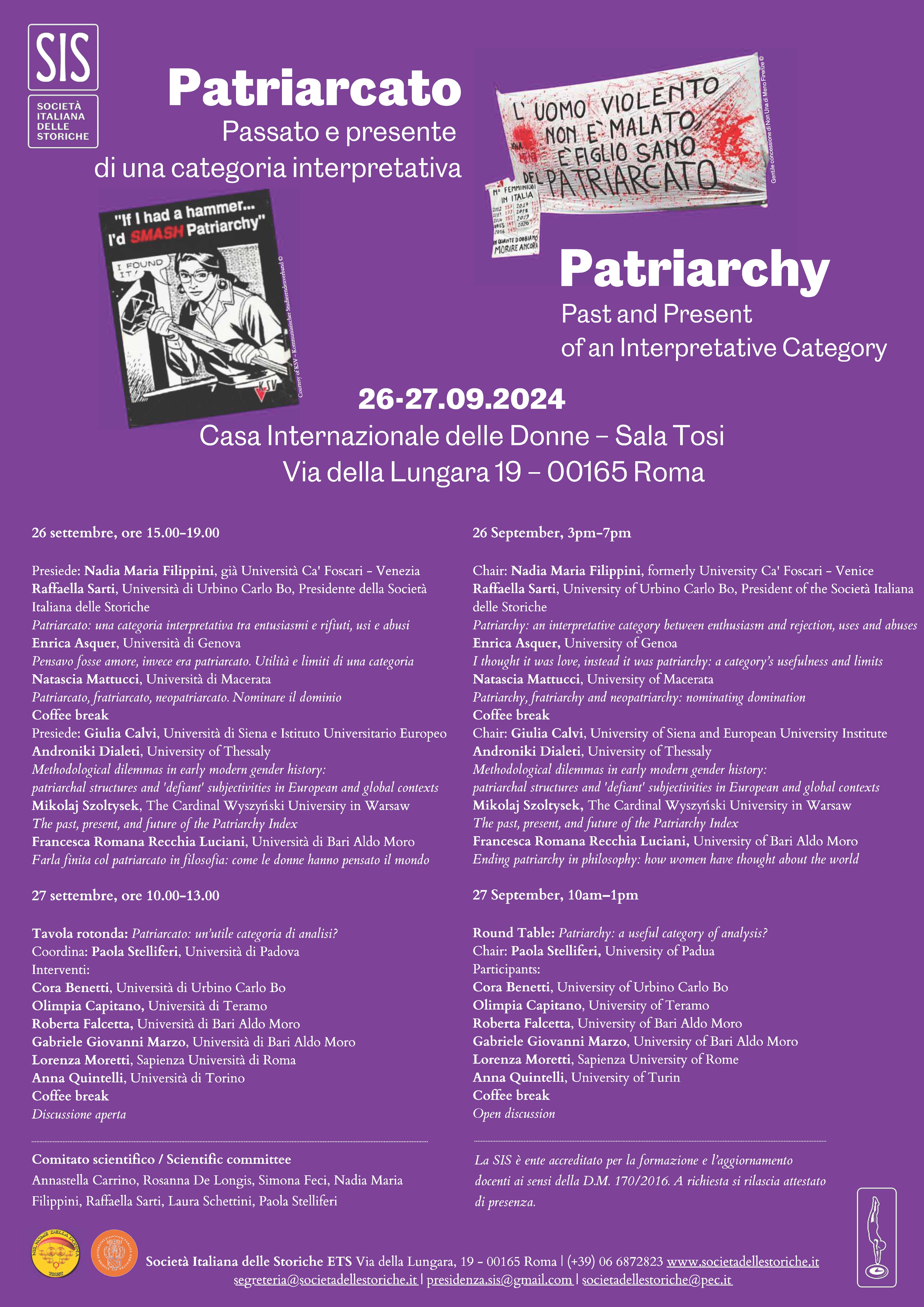 ![]() Il Convegno, organizzato dalla Società italiana delle Storiche, si tiene a Roma, presso la Casa Internazionale delle Donne - Sala Tosi, 26-27 settembre 2024 Programma 26 settembre, ore 15.00-19.00 Presiede: Nadia Maria Filippini, già Università Ca’ Foscari – Venezia Raffaella Sarti, Università di Urbino Carlo Bo, Presidente della Società Italiana delle Storiche Patriarcato: una categoria […] |