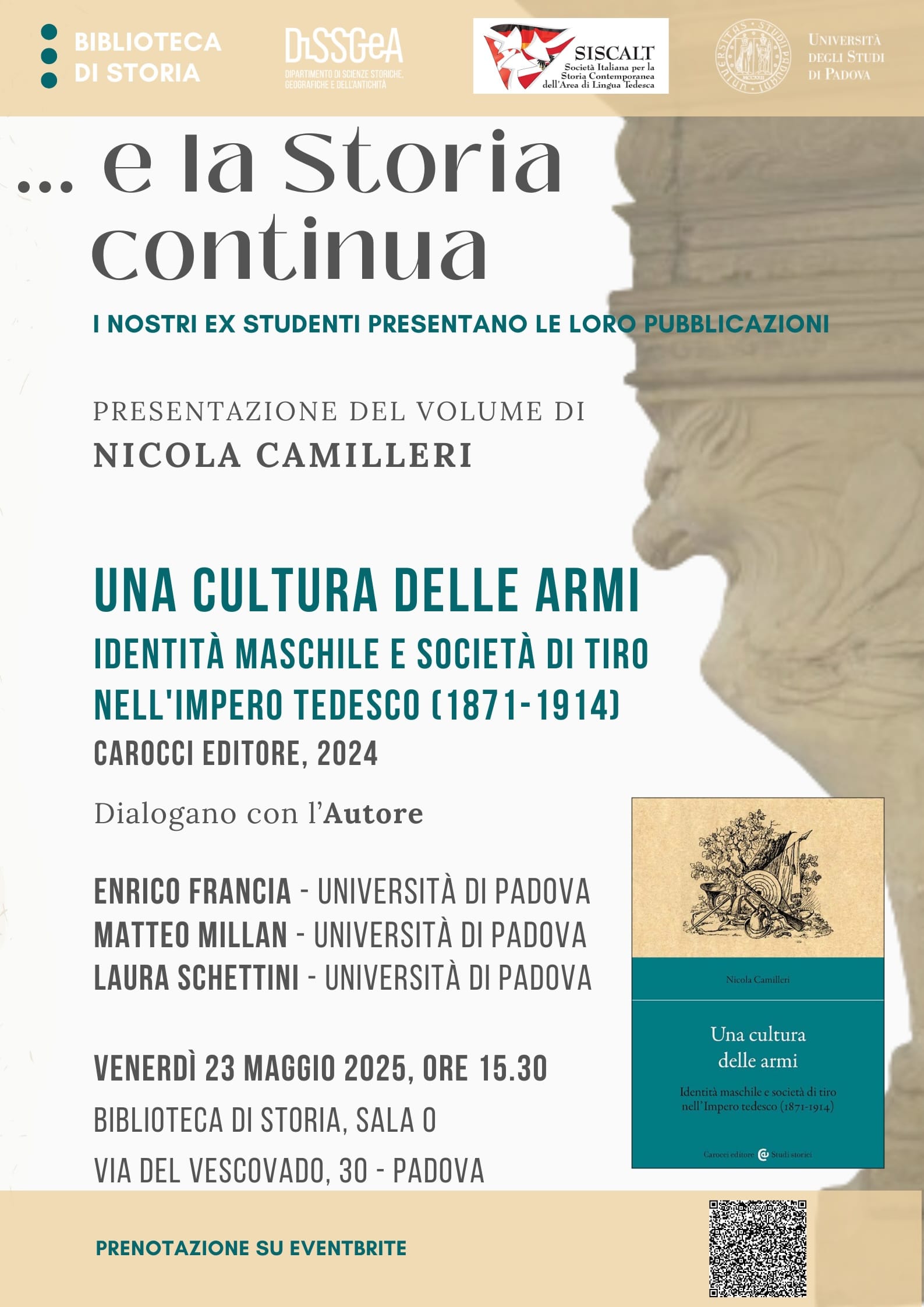 Venerdì 23 maggio alle ore 15.30, presso la Biblioteca di Storia dell'Università di Padova, Via del Vescovado 30, Padova, Nicola Camilleri presenterà il suo libro "Una cultura delle armi : identità maschile e società di tiro nell'impero tedesco (1871-1914)", edito da Carocci 2024. Negli anni precedenti alla Prima guerra mondiale, nell’Impero tedesco migliaia di uomini […]