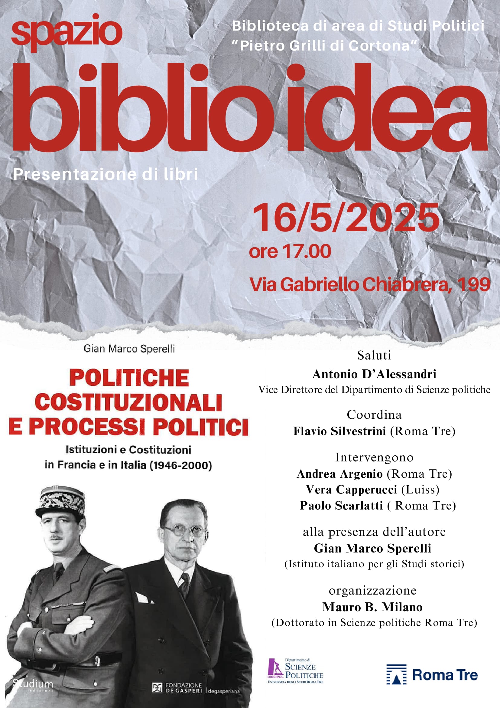 Nell’ambito della rassegna ‘spazio biblio idea – Presentazione di libri’, venerdì 16 maggio alle ore 17, presso la Biblioteca di area Studi politici “Pietro Grilli di Cortona” dell’università Roma Tre (via Gabriello Chiabrera, 199, 00145, Roma, III piano), si terrà la presentazione del volume di Gian Marco Sperelli (ricercatore post-doc, Istituto Italiano per gli Studi […]