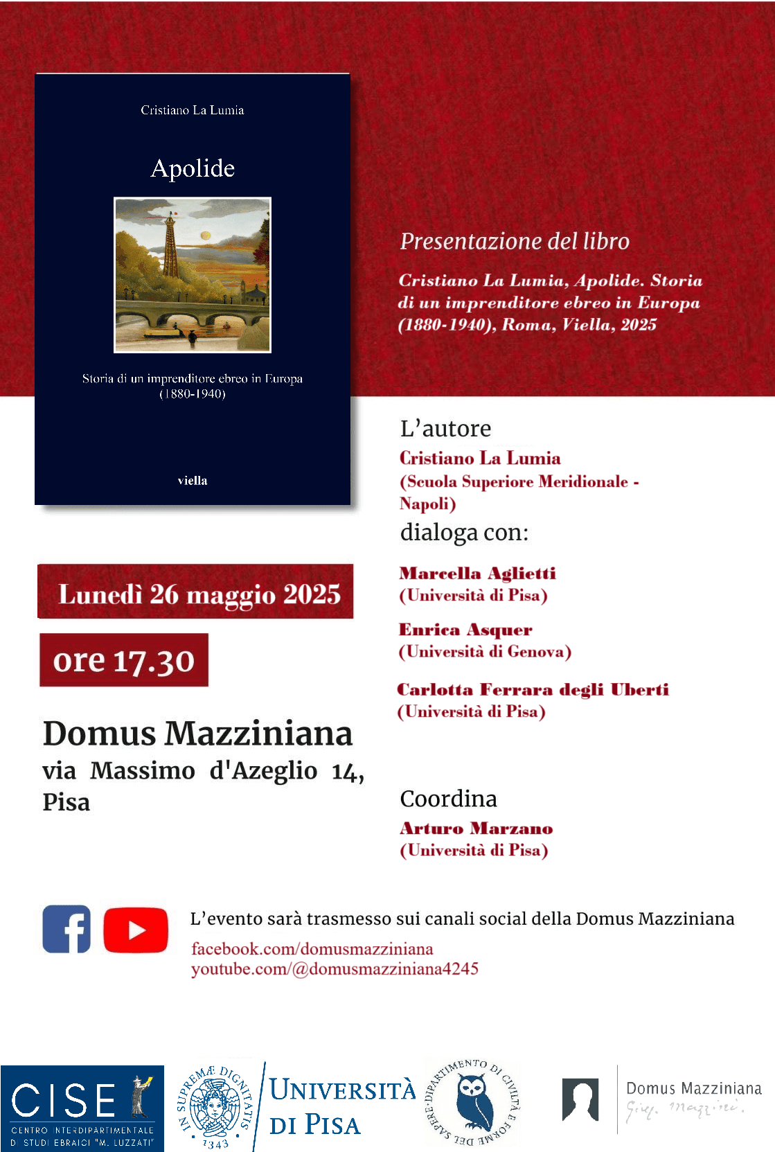 Lunedì 26 maggio alle ore 17.30 presso la Domus Mazziniana presentazione del volume di Cristiano La Lumia, "Apolide. Storia di un imprenditore ebreo in Europa (1880-1940), Roma, Viella, 2025, organizzata dalla Domus Mazziniana e dal CISE - Centro Interdipartimentale di Studi Ebraici dell'Università di Pisa. Il libro ripercorre le vicende di Berthold Margulies, un imprenditore […]