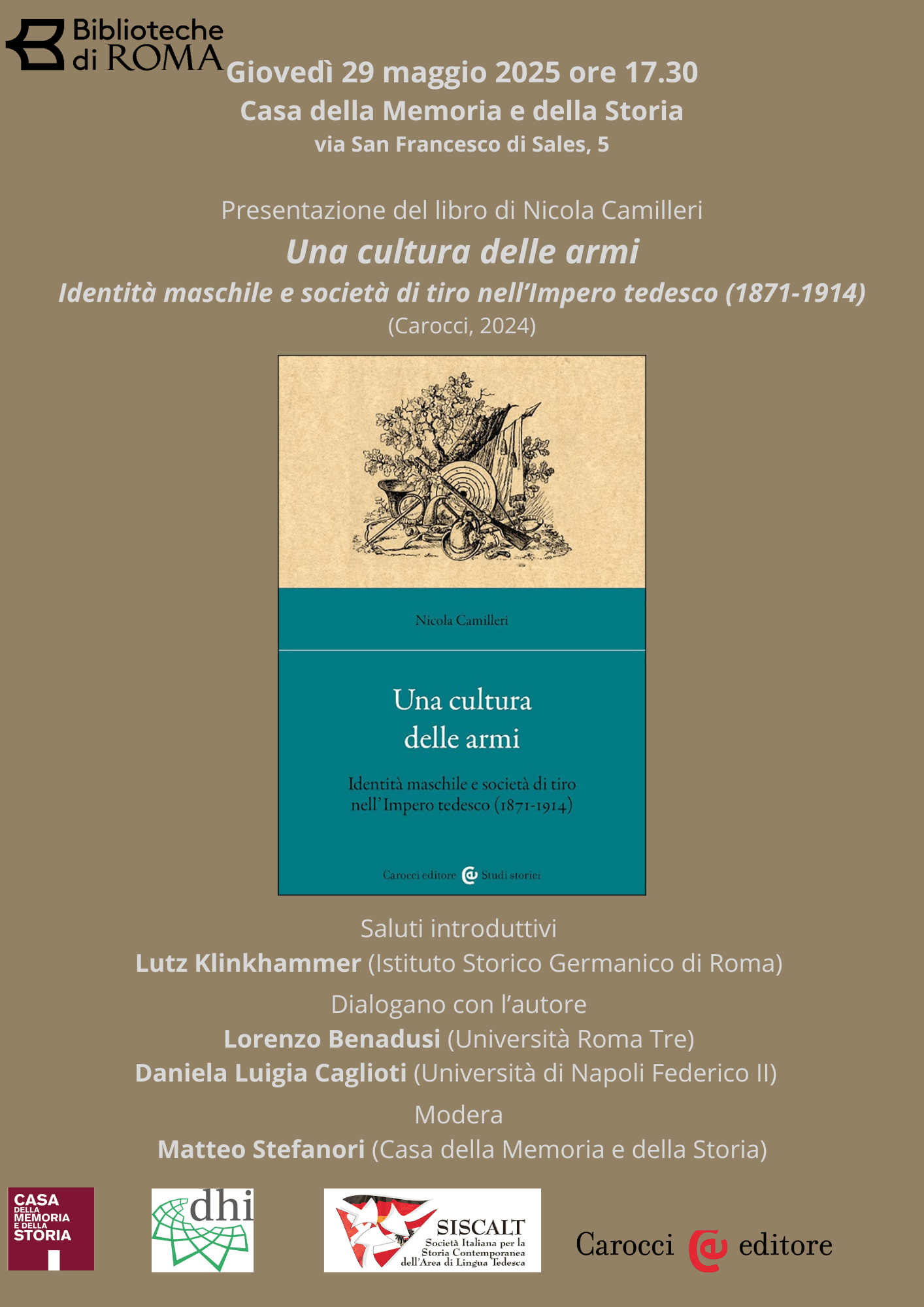 Presentazione del libro di Nicola Camilleri, Una cultura delle armi. Identità maschile e società di tiro nell'Impero tedesco (1871-1914) (Carocci, 2024), presso la Casa della memoria e della Storia, Via San Francesco di Sales 5, Roma, giovedì 29 maggio 2025, ore 17;30 Saluti introduttivi di Lutz Klinkhammer (Istituto Storico Germanico di Roma) Dialogano con l'autore […]