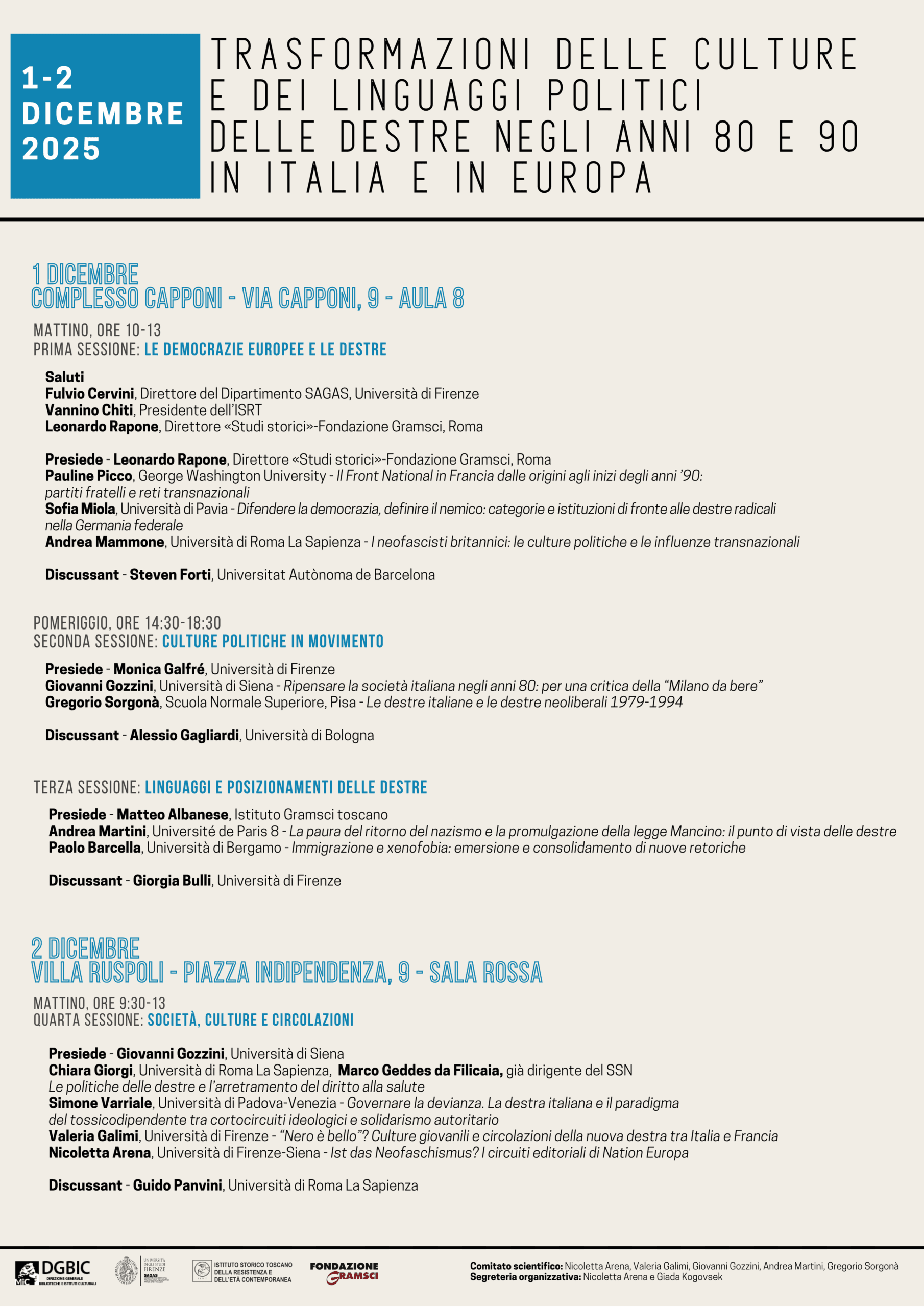 Il convegno "Trasformazioni delle culture e dei linguaggi politici delle destre negli anni Ottanta e Novanta in Italia e in Europa" si terrà a Firenze il 1 e 2 dicembre 2025. La prima giornata di studi si svolgerà presso il Complesso Capponi, in via Capponi 9, Aula 8, con orario 9:30-19:00. La seconda giornata avrà […]