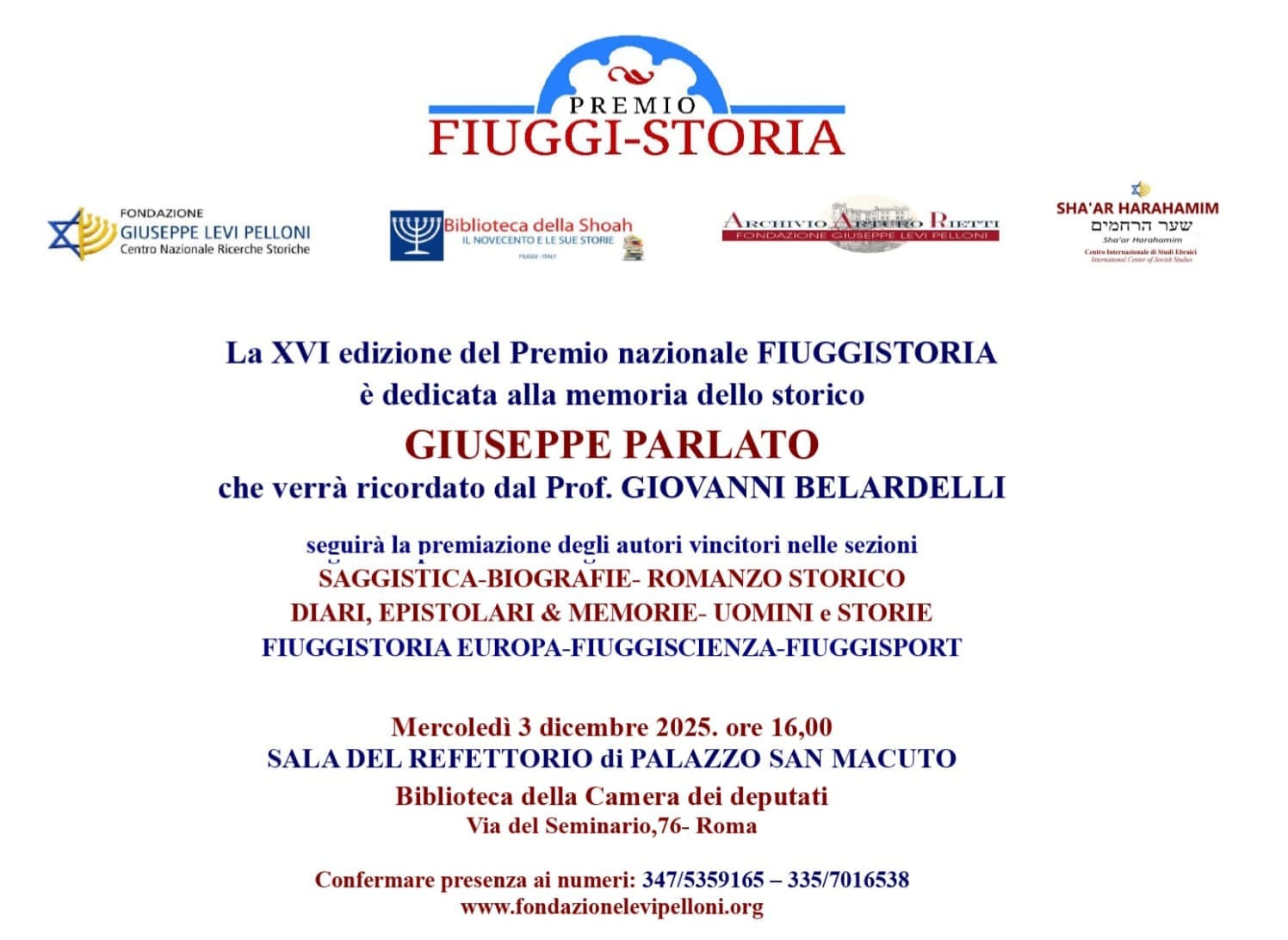 Mercoledì 3 dicembre 2025, alle ore 16.00, si terrà presso la Sala del Refettorio di Palazzo San Macuto (Biblioteca della Camera dei Deputati, via del Seminario 76, Roma) la cerimonia di premiazione della XVI edizione del Premio nazionale FiuggiStoria, dedicata quest’anno alla memoria di Giuseppe Parlato. Il Premio FiuggiStoria, promosso dalla Fondazione Giuseppe Levi Pelloni, […]