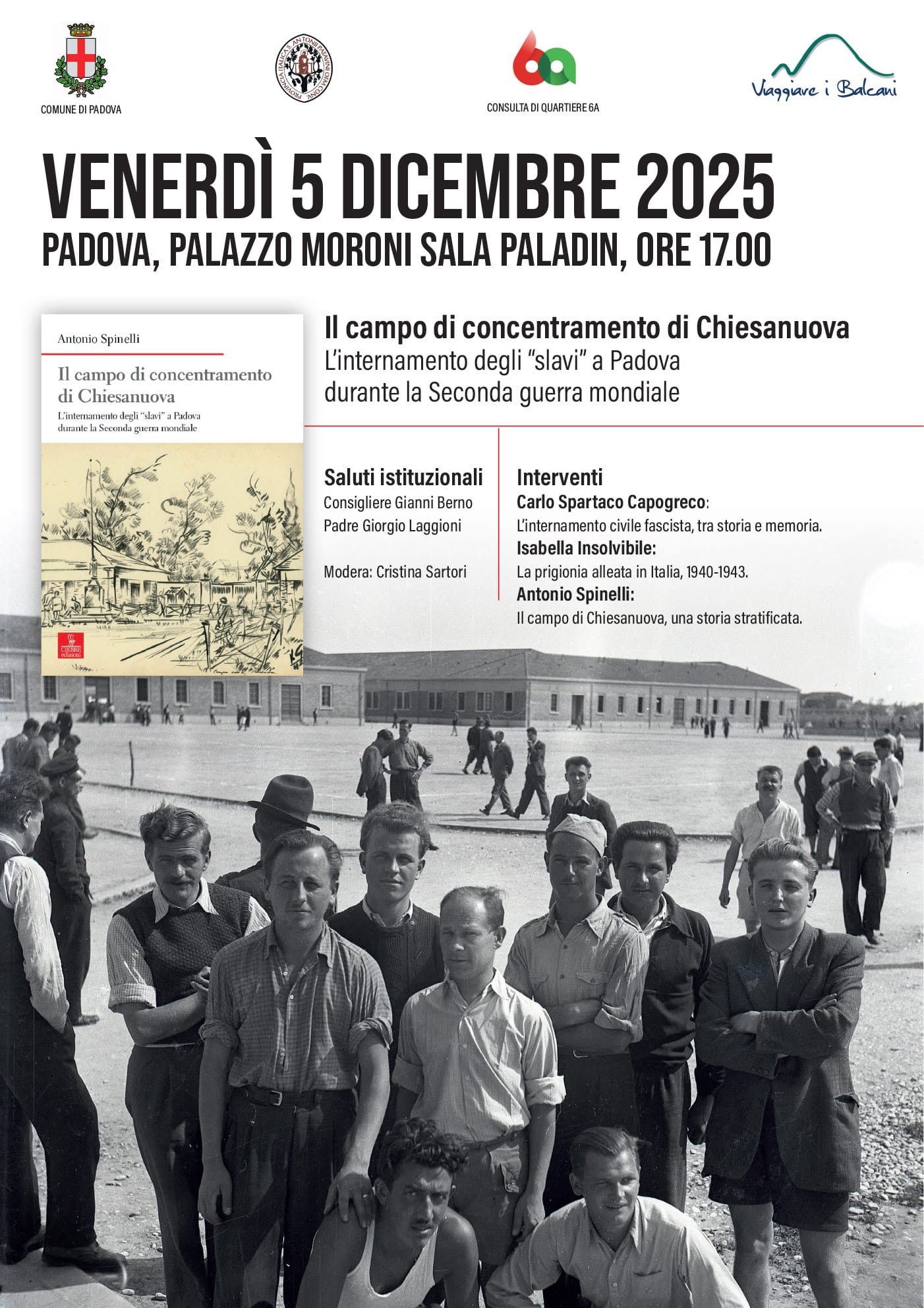 Venerdì 5 dicembre 2025, alle 17:00, nella sala Paladin del Comune di Padova, sarà presentato il libro di Antonio Spinelli dedicato al campo di concentramento di Padova in cui furono internarti gli "slavi" tra il 1942 e il 1943. Oltre all'autore, interverranno Carlo Spartaco Capogreco (con una relazione dal titolo "L'internamento civile fascista, tra storia […]