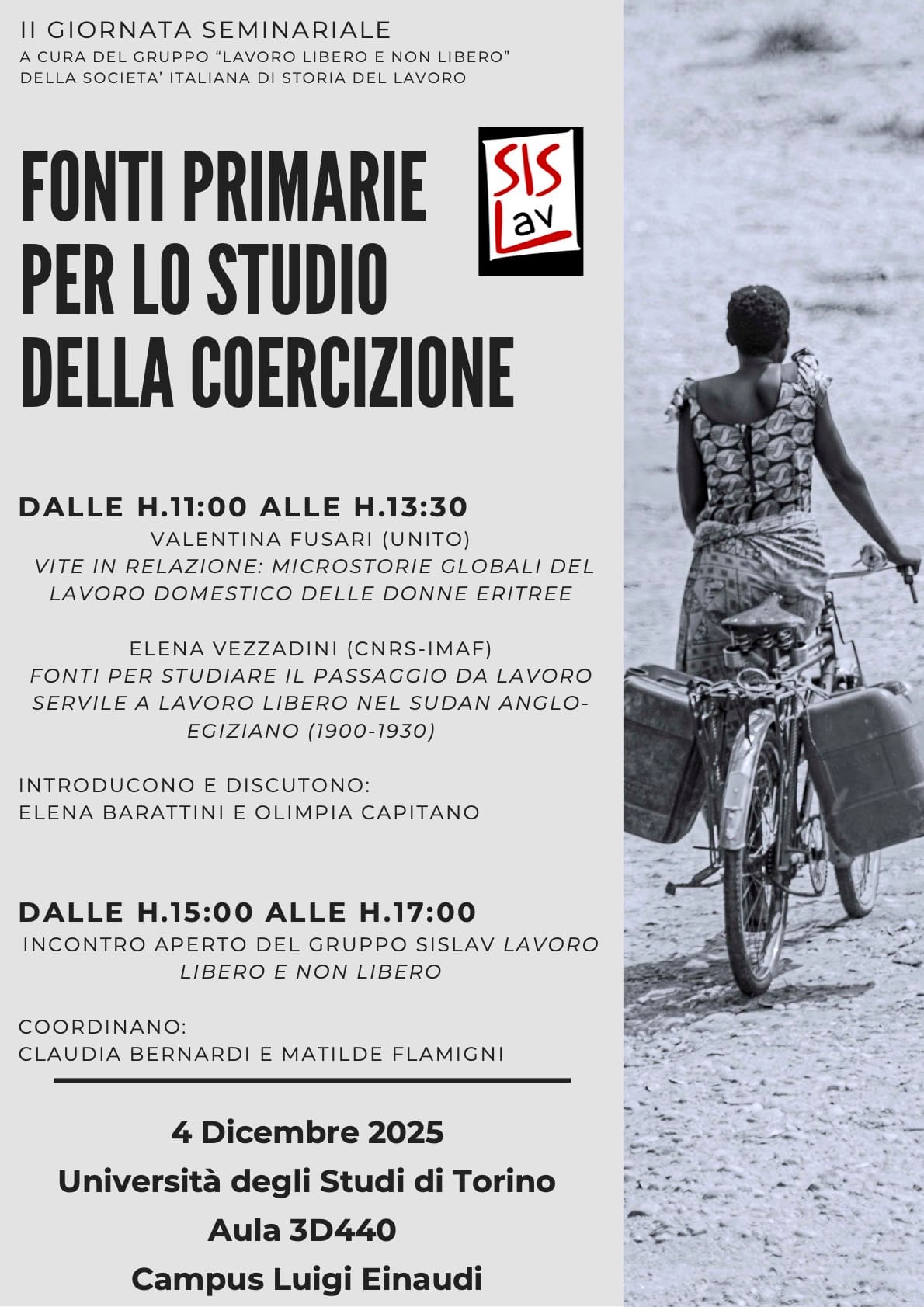 Fonti primarie per lo studio della coercizione 4 dicembre 2025 Aula 3D440, Campus Luigi Einaudi, Università degli studi di Torino 11:00-13:30 Valentina Fusari, “Vite in relazione: microstorie globali del lavoro domestico delle donne eritree” Elena Vezzadini, “Fonti per studiare il passaggio da lavoro servile a lavoro libero nel Sudan anglo-egiziano (1900-1930)” Introducono e discutono Elena […]