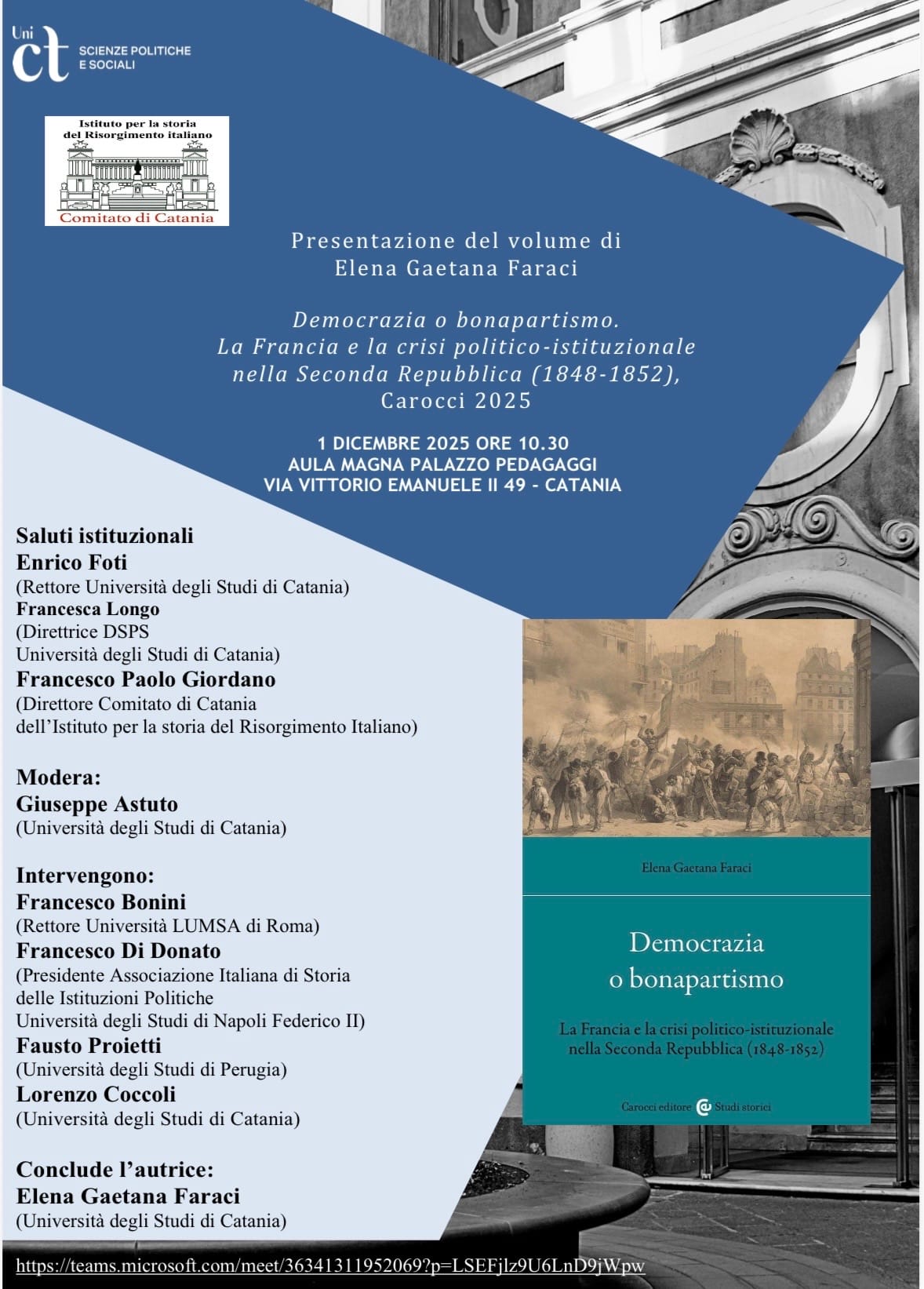 Lunedì 1 dicembre 2025 alle ore 10,30 presso l’Aula Magna del Dipartimento di Scienze politiche e sociali dell’Università di Catania in via Vittorio Emanuele II, n. 49 si terrà la presentazione del volume di Elena Gaetana Faraci, Democrazia o bonapartismo. La Francia e la crisi politico-istituzionale nella Seconda Repubblica (1848-1852), Carocci 2025. Dopo i saluti […]
