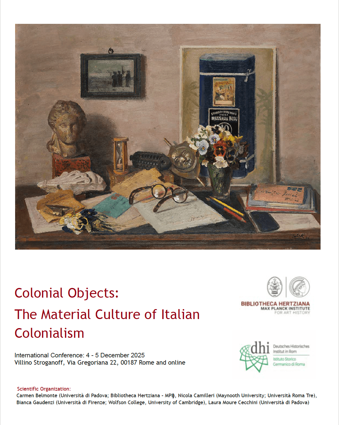 Giovedì 4 e venerdì 5 dicembre alla Bibliotheca Hertziana di Roma si terrà un convegno internazionale sul tema "Colonial Objects: The Material Culture of Italian Colonialism", organizzato da Carmen Belmonte (Università di Padova; Bibliotheca Hertziana – MPI), Nicola Camilleri (Maynooth University), Bianca Gaudenzi (SAGAS, Università di Firenze), Laura Moure Cecchini (Università di Padova). Il convegno […]