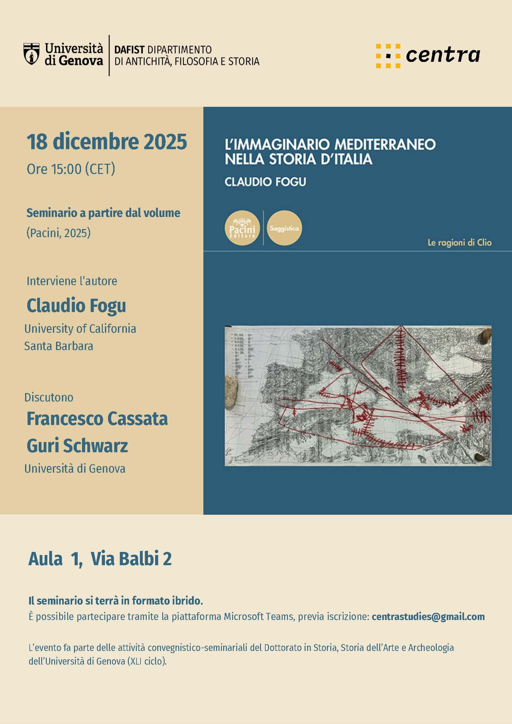 Giovedì 18 dicembre, alle ore 15:00 (Aula 1, via Balbi 2, Università di Genova), si terrà il seminario a partire dal volume di CLAUDIO FOGU (UC Santa Barbara), “L'immaginario mediterraneo nella storia d'Italia". Discutono: FRANCESCO CASSATA (Università di Genova) GURI SCHWARZ (Università di Genova) L’evento, organizzato dal CENTRA (Centre for the History of Racism and […]