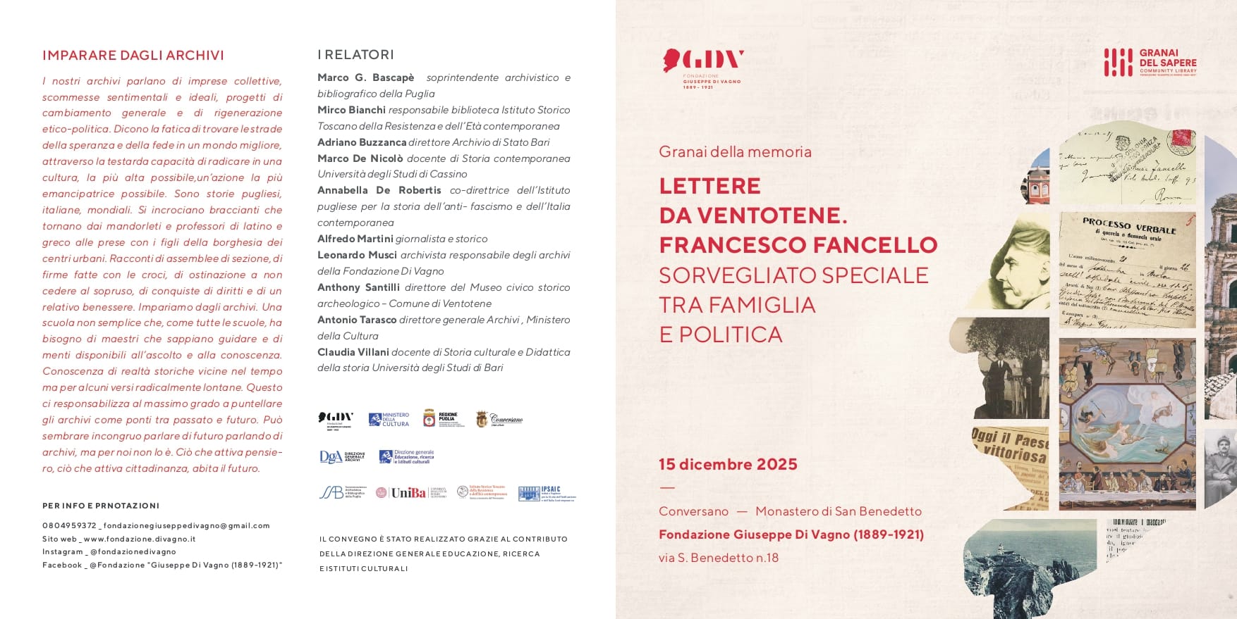 L’iniziativa si terrà lunedì 15 dicembre 2025 presso la sede della Fondazione Giuseppe Di Vagno, a Conversano (BA). Il convegno prende spunto dal recente versamento alla Fondazione di una parte dell’archivio personale di Francesco Fancello, figura centrale del Partito sardo d’azione, tra l'altro confinato a Ponza e poi a Ventotene. È prevista la partecipazione di […]
