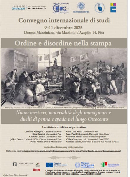 Si segnala il convegno internazionale di studi “Ordine e disordine nella stampa: nuovi mestieri, materialità degli immaginari e duelli di penna e spada nel lungo Ottocento”, in programma dal 9 all’11 dicembre 2025 presso la Domus Mazziniana (via Massimo d’Azeglio 14, Pisa). L’iniziativa, realizzata con il contributo del Dipartimento di Eccellenza “Civiltà e Forme del […]