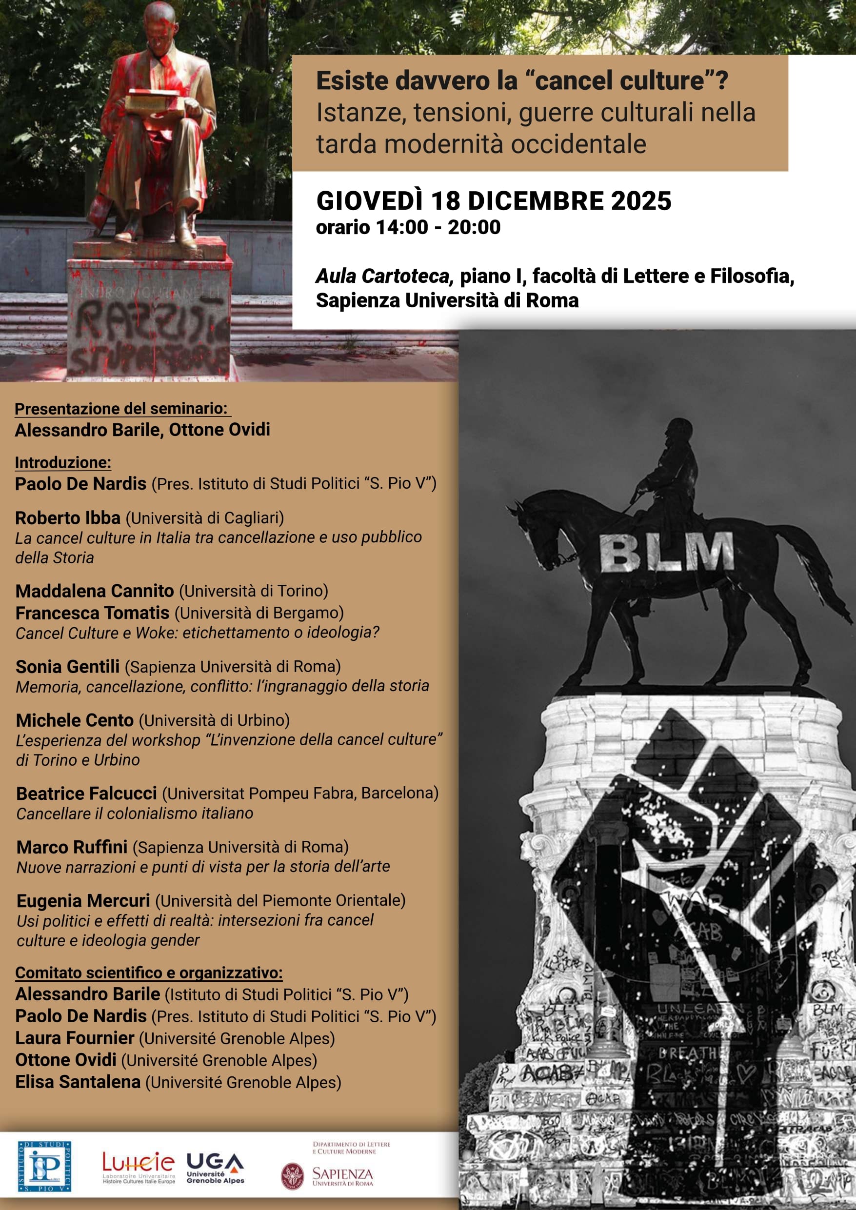 Secondo incontro sul tema della "cancel culture" organizzato dal Laboratoire Universitaire Histoire Cultures Italie Europe (LUHCIE)-Université Grenoble Alpes e dall'Istituto di Studi Politici "S. Pio V". Interverranno come relatori: - Roberto Ibba (Università di Cagliari) - Maddalena Cannito (Università di Torino) - Francesca Tomatis (Università di Bergamo) - Sonia Gentili (Sapienza Università di Roma) - […]