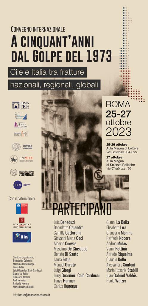 Il Convegno internazionale è organizzato per riflettere sul cinquantesimo anniversario del colpo di Stato in Cile dell’11 settembre 1973 che interruppe tragicamente l’esperienza del governo di Salvador Allende e instaurò una delle più feroci dittature militari dell’America Latina del Novecento. Il golpe, inteso come momento di frattura nazionale, regionale e globale in un’ottica di mutamenti transnazionali, sarà l’oggetto del programma delle attività, avvalendosi della collaborazione di studiosi ed esperti di altre Università europee e cilene. Una sezione è dedicata In quest’ottica la commemorazione dell’evento intende proporre approfondimenti e analisi storiche e storiografiche in relazione anche alle attuali dinamiche politiche cilene e al dibattito attuale nell’opinione pubblica. L’approccio multidisciplinare caratterizzerà la riflessione a largo raggio sulla storia cilena e cosa questa abbia rappresentato nell’immaginario collettivo prima, durante e dopo il triennio di UnidadPopular nel quadro della storia globale e delle connessioni transnazionali tra la storia cilena e quella di altri paesi.
