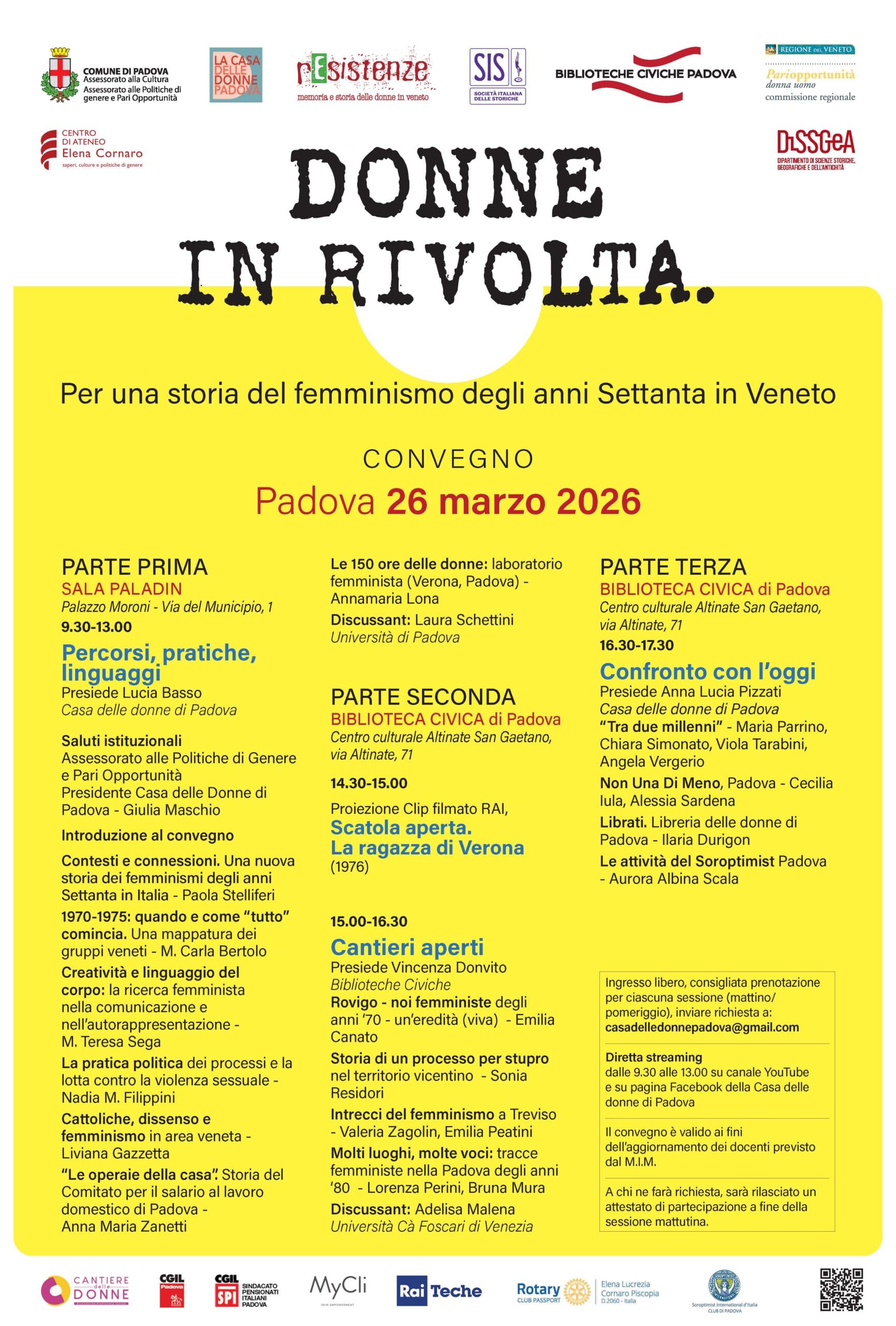 Il convegno Donne in rivolta. Per una storia del femminismo degli anni Settanta in Veneto si terrà a Padova il 26 marzo 2026, nella mattinata presso la Sala Paladin del Comune di Padova – Palazzo Moroni (Via del Municipio 1) e nel pomeriggio presso la Biblioteca Civica – Centro culturale Altinate – San Gaetano (Via Altinate 71).