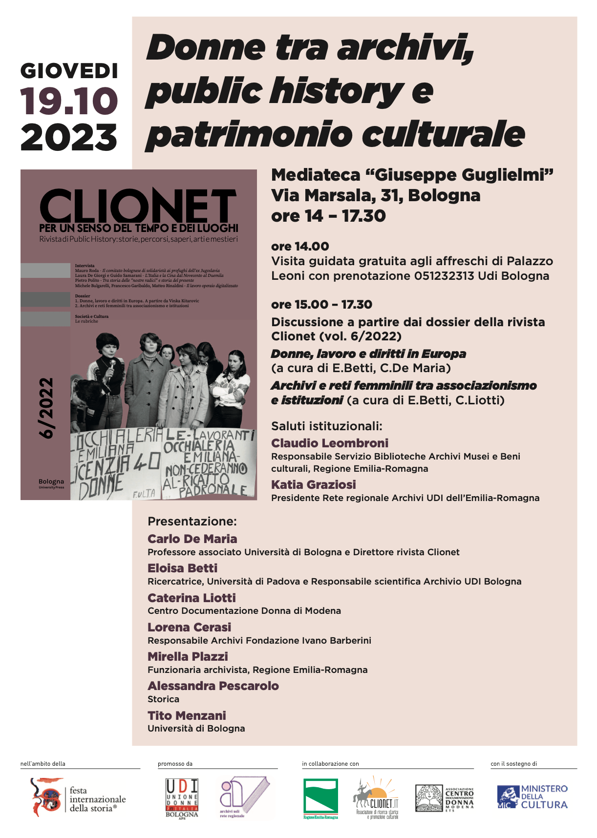 Presentazione: Carlo De Maria (Professore associato Università di Bologna e Direttore rivista Clionet), Eloisa Betti (Ricercatrice, Università di Padova e Responsabile scientifica Archivio UDI Bologna), Caterina Liotti (Centro Documentazione Donna di Modena), Lorena Cerasi (Responsabile Archivi Fondazione Ivano Barberini), Mirella Plazzi (Funzionaria archivista, Regione Emilia-Romagna), Alessandra Pescarolo (Storica), Tito Menzani (Università di Bologna).