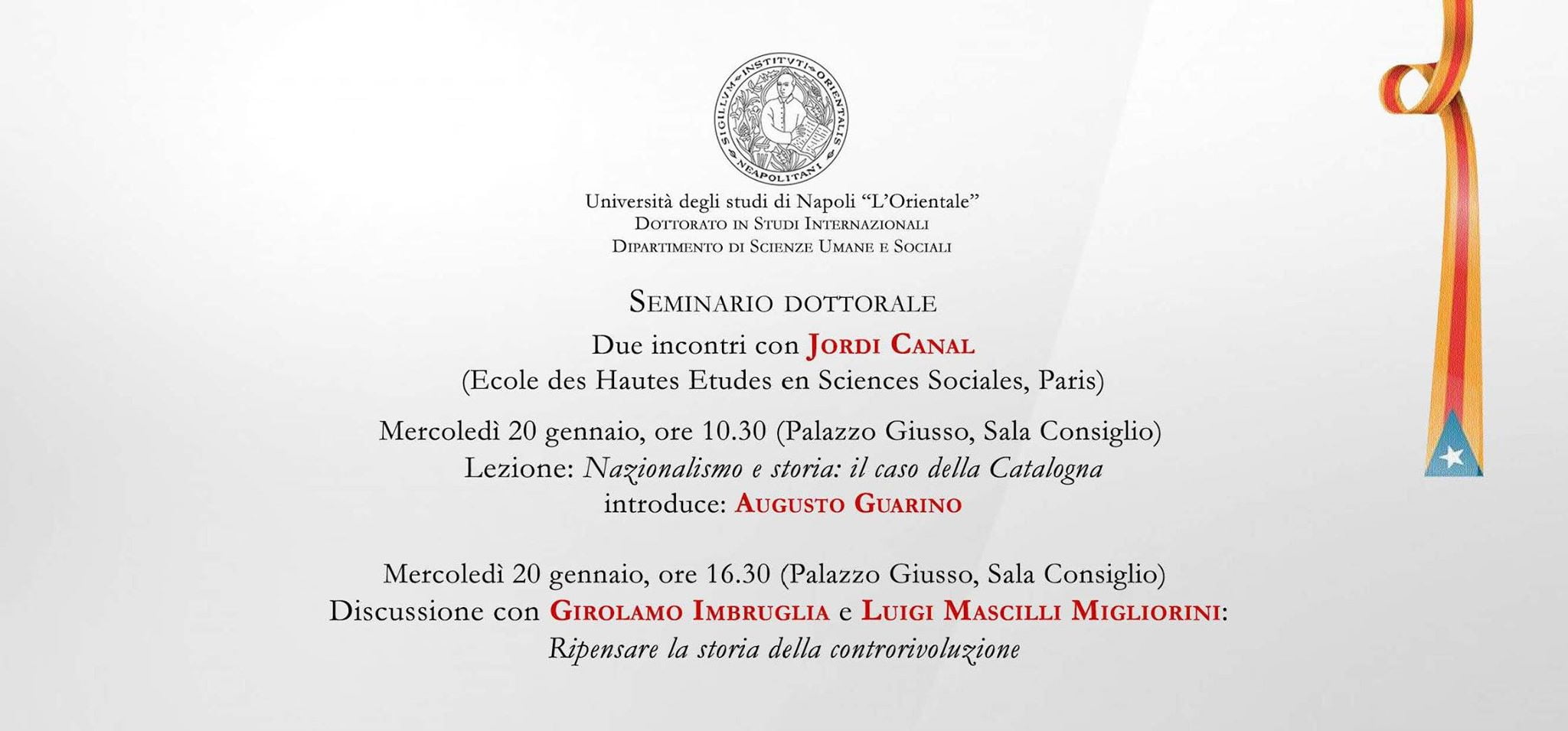 Mercoledì 20 gennaio 2016, all’Università degli Studi di Napoli “L’Orientale” (Palazzo Giusso, Sala del Consiglio), si terrà una giornata di studi, nell’ambito del Dottorato in Studi Internazionali, costituita da due incontri con Jordi Canal (École des Hautes Études en Sciences Sociales, Paris). Alle ore 10.30 ci sarà la lezione “Nazionalismo e storia: il caso della Catalogna”, introdotta da Augusto Guarino. Seguirà, alle 16.30, la discussione con Girolamo Imbruglia e Luigi Mascilli Migliorini sul tema “Ripensare la controrivoluzione”.