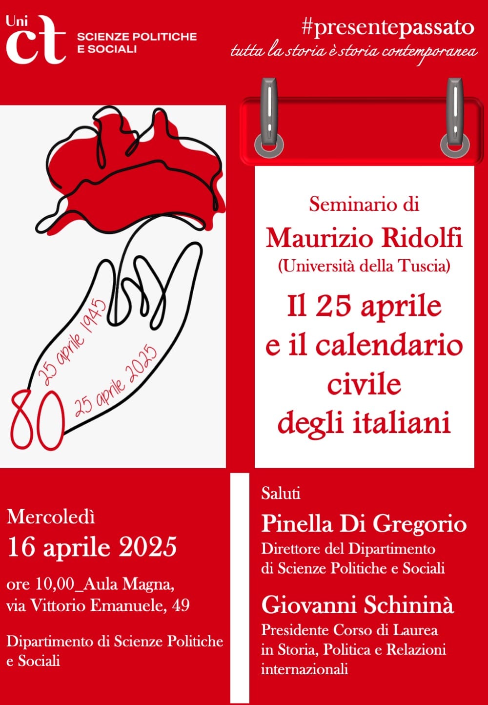 Mercoledì 16 aprile, alle ore 10.00, presso il Dipartimento di Scienze Politiche e Sociali (Aula Magna, Palazzo Pedagaggi, via Vittorio Emanuele n. 49), un nuovo appuntamento del ciclo di incontri #presentepassato: in occasione dell’80° anniversario della Liberazione italiana, Maurizio Ridolfi (Università della Tuscia) terrà un seminario dal titolo Il 25 aprile e il calendario civile degli italiani.