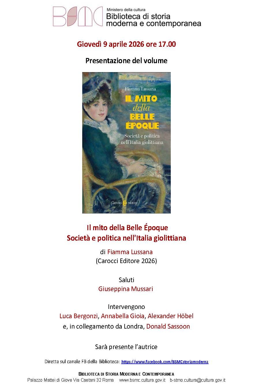 Giovedì 9 aprile 2026 alle 17.00, a Roma, presso la Biblioteca di storia moderna e contemporanea (Via Michelangelo Caetani, 32) si presenta il volume Il mito della Belle Époque. Società e politica nell’Italia giolittiana di Fiamma Lussana (Carocci 2026).