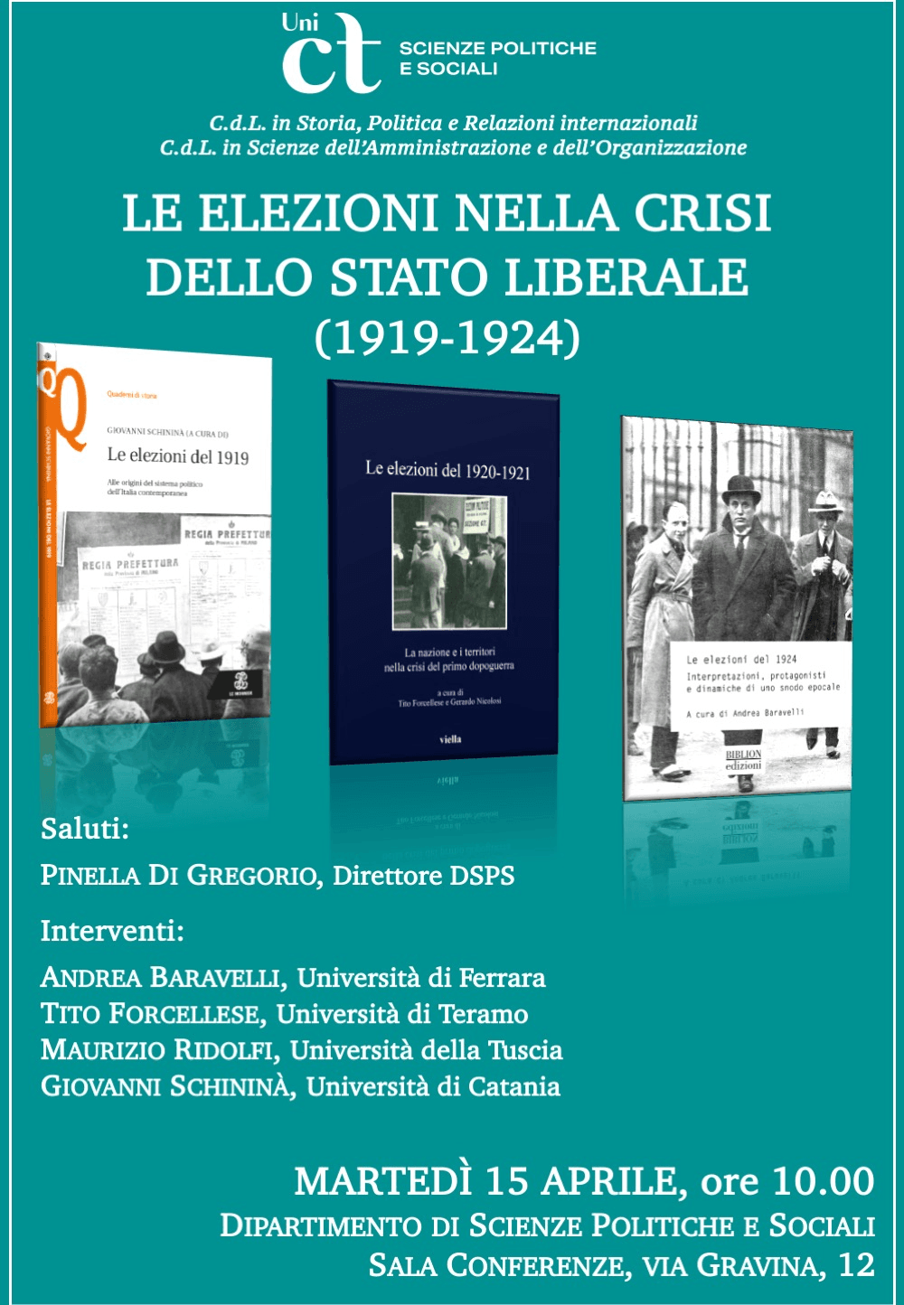 Ai saluti di Pinella Di Gregorio, Direttore del DSPS, seguiranno gli interventi di Andrea Baravelli (Università di Ferrara), Tito Forcellese (Università di Teramo), Maurizio Ridolfi (Università della Tuscia) e Giovanni Schininà (Università di Catania).