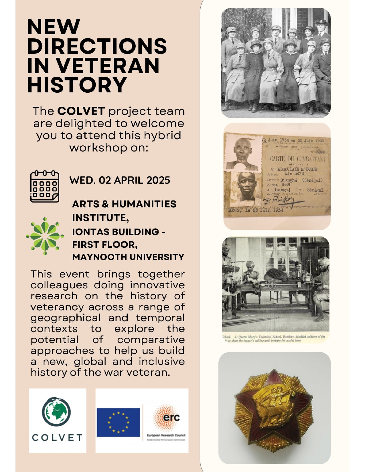 The worlshop brings together colleagues doing innovative research on the history of veterancy across a range of geographical and temporal contexts to explore the potential of comparative approaches to help us build a new, global and inclusive history of the war veteran. COLVET is a four-year interdisciplinary project funded by the European Research Council (ERC) Startign Grant led by Prof. Dónal Hassett, Department of History, Maynooth University.