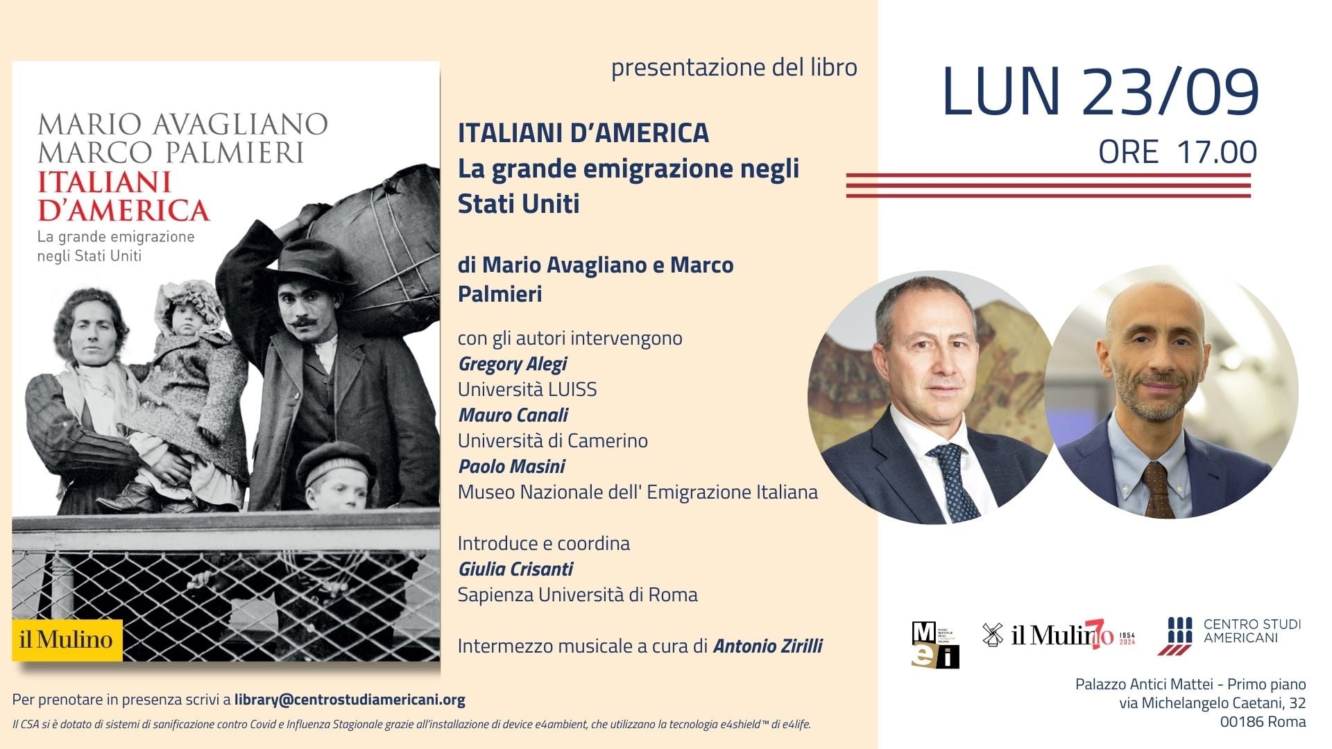 Si terrà al Centro Studi Americani il prossimo 23 settembre alle ore 17 la presentazione del libro di Mario Avagliano e Marco Palmieri, “Italiani d’America: La grande emigrazione negli Stati Uniti” (il Mulino 2024).