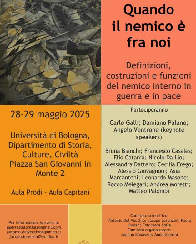 Figura da sempre sfaccettata e problematica, il nemico interno ha assunto funzioni e attributi peculiari nel corso dell’epoca moderna a partire dalle guerre civili di religione, dalle esperienze rivoluzionarie e dalle guerre d’indipendenza, fino al Novecento delle guerre mondiali, dei totalitarismi, della guerra fredda e del costante riemergere negli ultimi decenni di guerre civili e conflitti asimmetrici.
