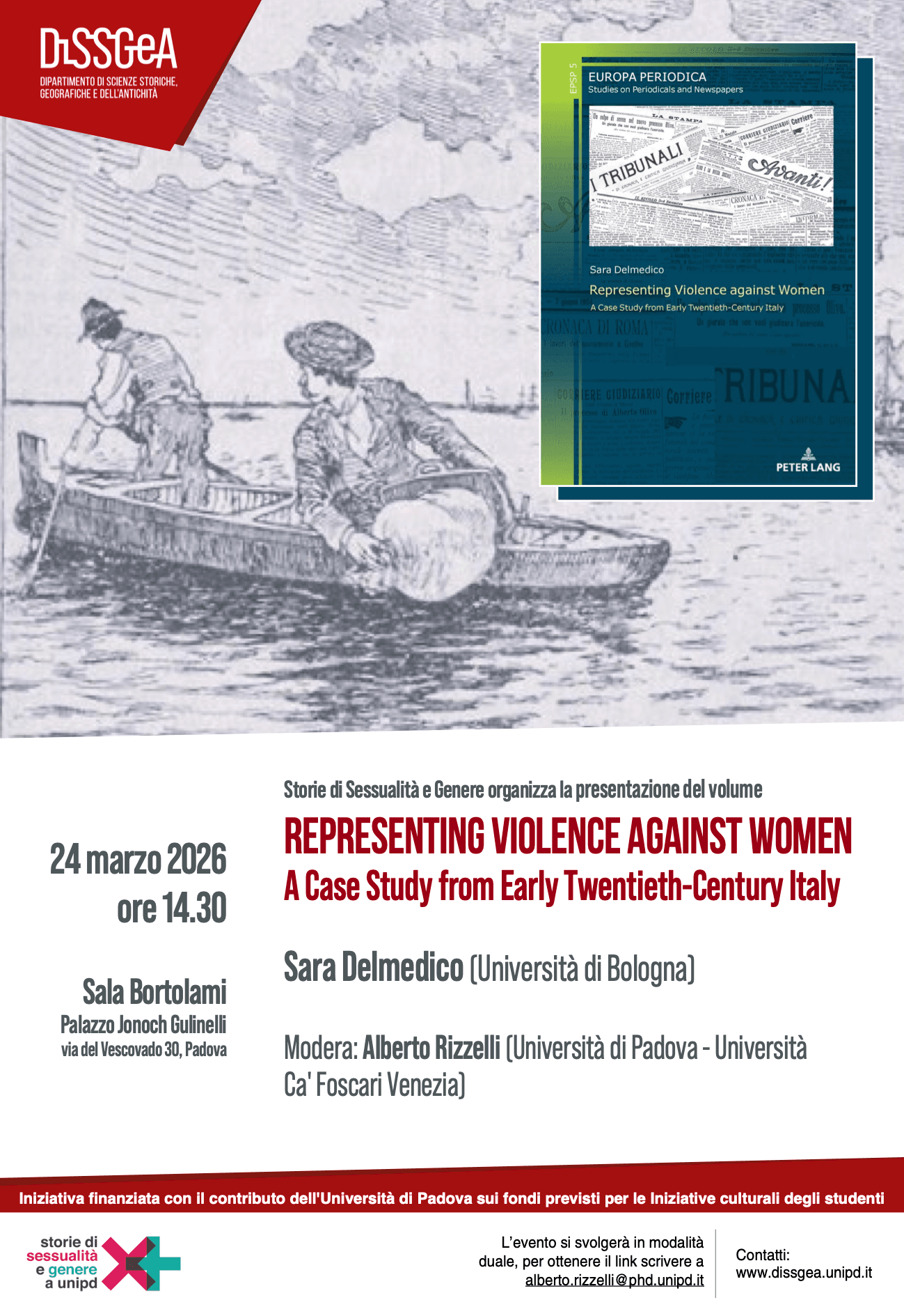 Il gruppo Storie di Sessualità e Genere dell’Università di Padova organizza la presentazione del libro di Sara Delmedico (Università di Bologna), “Representing Violence against Women. A Case Study from Early Twentieth-Century Italy” (Peter Lang, 2025). Sarà presente l’autrice, con la moderazione di Alberto Rizzelli (Università di Padova, Università Ca’ Foscari Venezia).