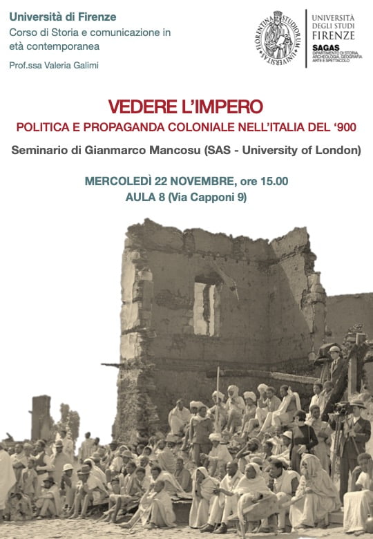 Il 22 novembre alle ore 15 (aula 8, Complesso Capponi, via Capponi, 9 – Università di Firenze), all’interno del Corso di Storia e comunicazione in età contemporanea della prof.ssa Valeria Galimi, il dr. Mancosu terrà un seminario dal titolo “Vedere l’Impero. Politica e propaganda coloniale nell’Italia del ‘900”. L’incontro è aperto a tutti/e gli/le interessati/e.