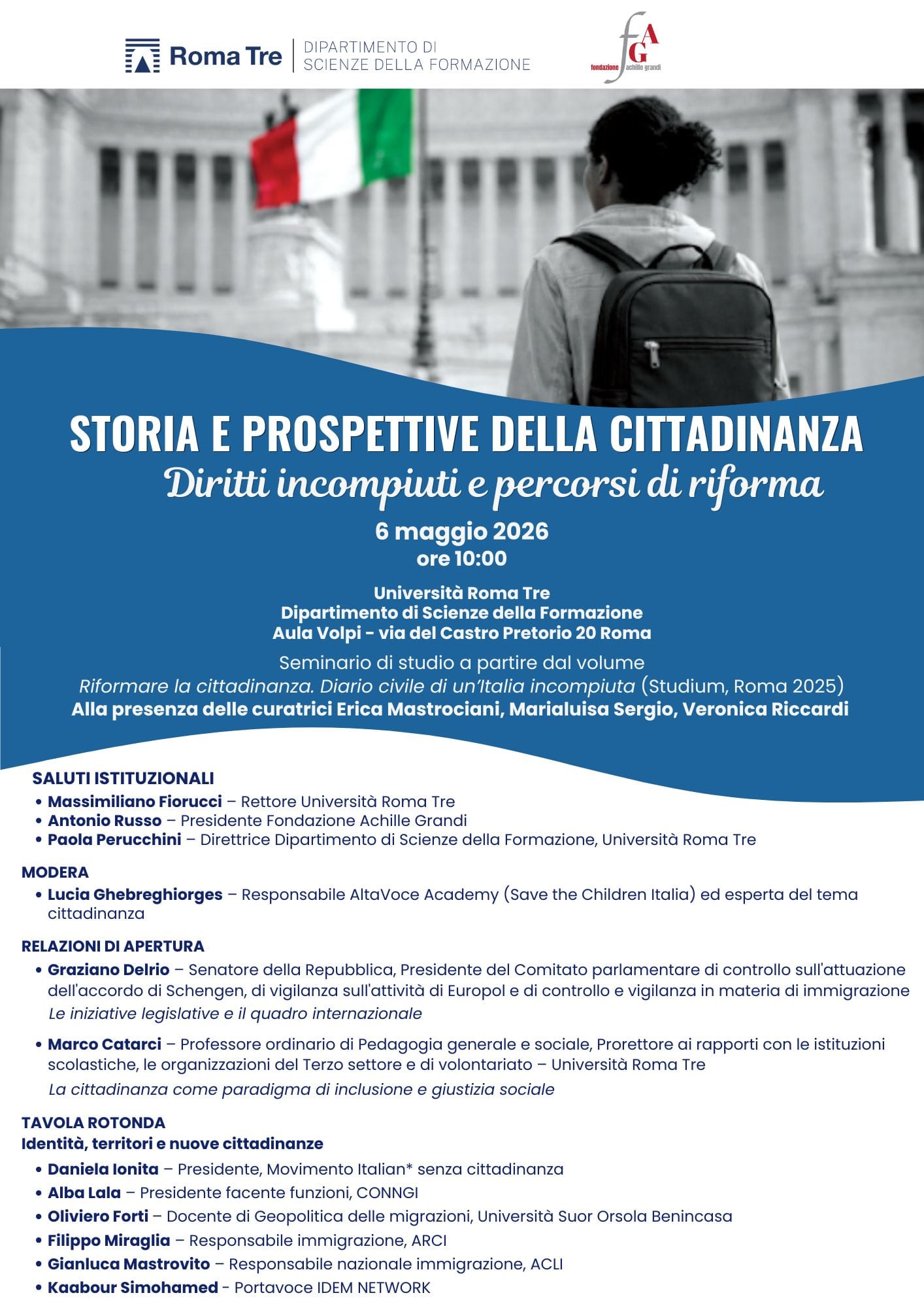 Seminario di studio a partire dal volume “Riformare la cittadinanza. Diario civile di un’Italia incompiuta” (Studium, 2025) a cura di Erica Mastrociani, Veronica Riccardi, Marialuisa Sergio.
