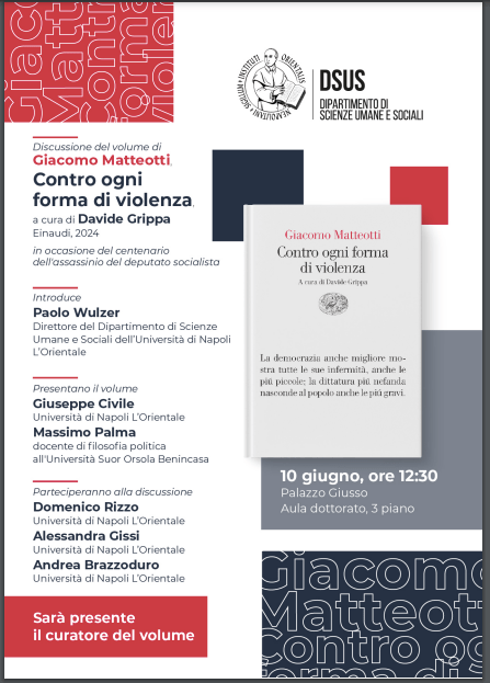In occasione del centenario dell'assassinio del deputato socialista, Giuseppe Civile e Massimo Palma presenteranno il volume curato da Davide Grippa, Giacomo Matteotti, Contro ogni forma di violenza, Einaudi, 2024. Parteciperanno alla discussione : Andrea Brazzoduro, Alessandra Gissi, Domenico Rizzo
