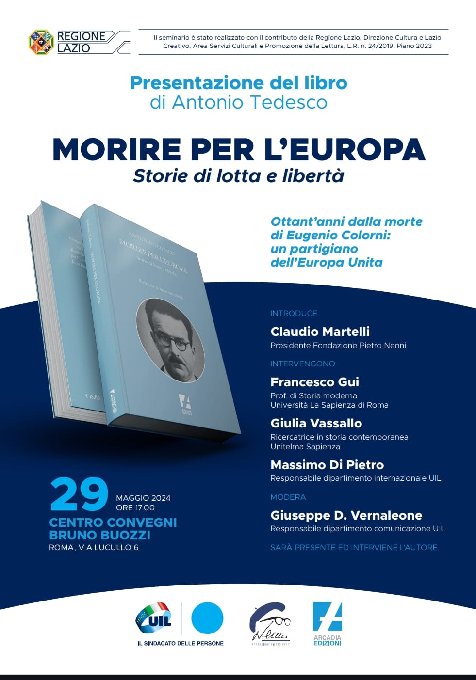 Gentili socie/i, sperando di fare cosa gradita, si segnala l'uscita del libro "Morire per l'Europa", prefazione di Maurizio Ridolfi, Arcadia Edizioni, che verrà presentato il 29 maggio alla UIL Nazionale., in occasione dell'80° anniversario della morte di Eugenio Colorni. Nel volume si delinea, attraverso cinque biografie di altrettanti antifascisti democratici (Colorni, Braccialarghe, Pistocchi, Battistelli e […]